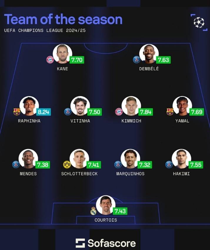 Sofa评本赛季欧冠最佳阵:登贝莱领衔巴黎5人,亚马尔、凯恩在列
